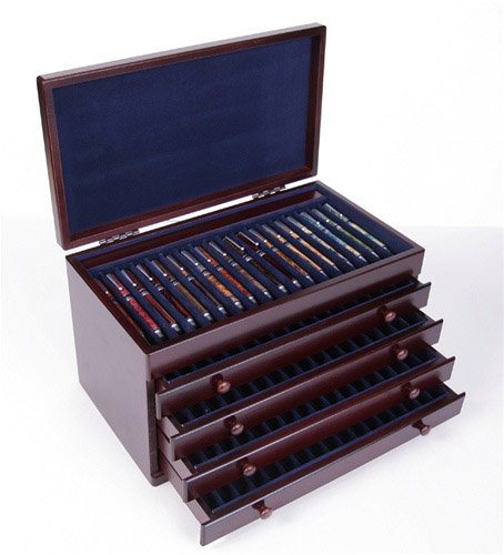 This beautiful 86 pen chest is made from stained mahogany with brass hardware and a solid top. 18 pens are displayed under the lid and 68 pens fit nicely in each of the remaining 4 drawers. Features blue contoured foam inserts designed to showcase 64 of your favorite medium to small size writing instruments.